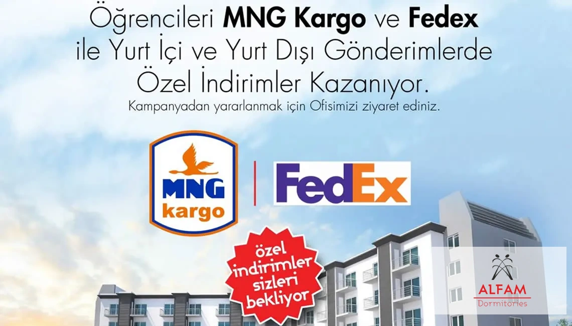 Alfam Öğrenci Yurtlarının MNG Kargo ile yaptığı anlaşma sonucunda öğrencilerimize %30 indirim sağlanıyor.